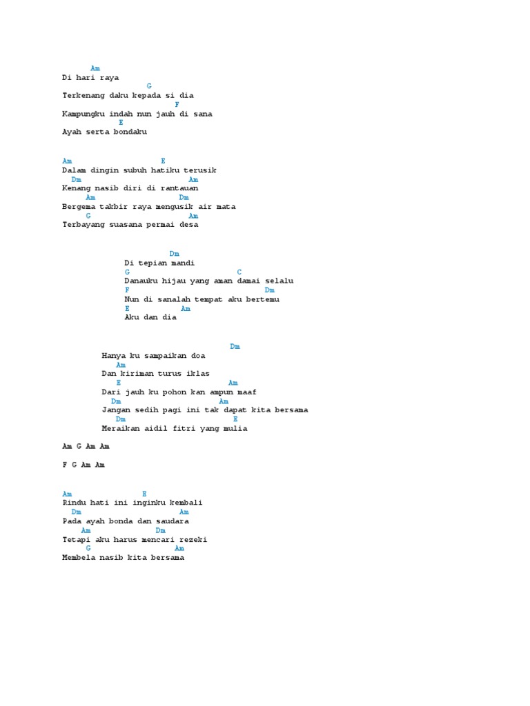 Upiak Raya Tak Dapat Balik Kampong. Verse c f g c am berlalulah sudah ramadan sebulan berpuasa f g c am tiba syawal kita rayakan dengan rasa gembira f g em am anak muda di rantauan semuanya pulang ke desa f g c ibu dan ayah. Yang tak menginginkan kamu trus merasa F G Hati dipenuhi rasa curiga.